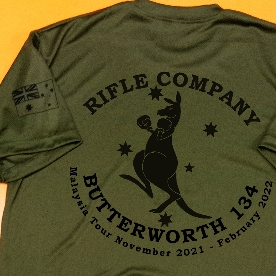 Made from microfiber drip dry cloth, the shirt has the Boxing Kangaroo in its prominent stride with a backdrop caption that reads RCB134 BUTTERWORTH MALAYSIA, marked by the tour dates.