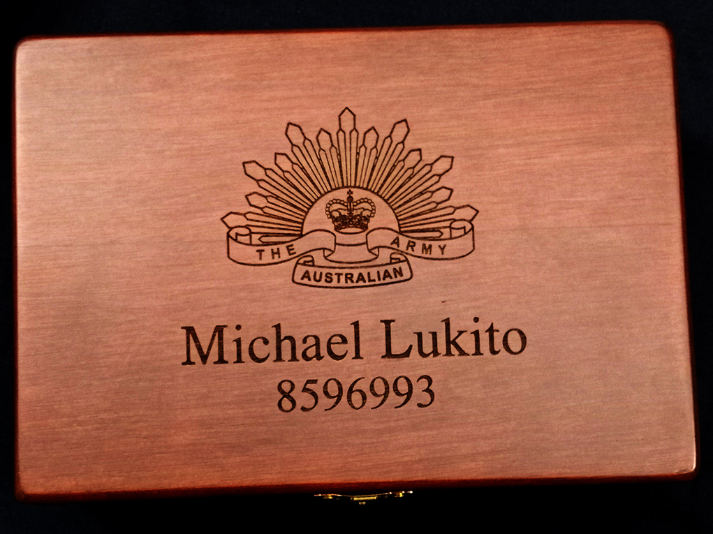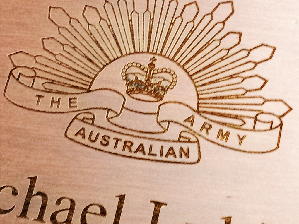 The medal boxes can be commissioned with a person’s Name, Rank, Service number and Regimental Cap Badge. The Cap badge or logo is engraved directly into the box lid showing the natural lighter colour of the wood underneath (the colour of the woodgrain on the engraved image is also subject to variations as wood is a natural product and will have individual colour differences as nature intended).