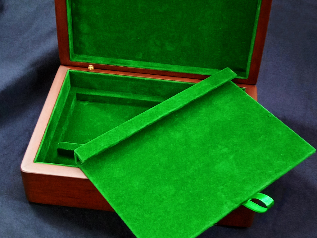 The inside of the box is neatly lined with deep green non-slip suede lining